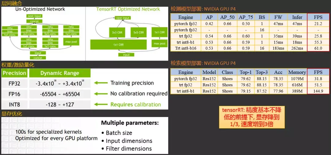 tensorRT 是英伟达开发的部署平台,能够有效的降低模型显存,加速模型前向速度。这里我们不展开细节,大家可以关注下面的检测模型和检索模型,通过 tensorRT 量化加速后,显存和速度都有了巨大的飞跃。