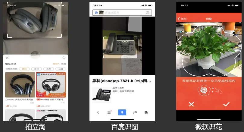 从图 4 展示的整体框架可知,扫一扫识物的首要步骤就是主体检测,即先定位用户感兴趣的区域,去除掉背景对后续环节的干扰。主体检测基本是大部分以图搜图产品的公认首要操作,如下图 7 所示的阿里的拍立淘,百度的拍照识图,以及微软的识花小程序。当然主体检测的算法各有差异,如拍立淘采用的是物体检测算法,百度识图采用的是显著性区域预测,微软识花需要用户配合定位。为了解放用户,我们希望算法能够自动定位商品区域,考虑到显著性区域预测很难处理多个商品出现在视野的情况,类似拍立淘,我们采用更加精确的物体检测算法来定位商品位置,并选择置信度最高的商品进行后续的商品检索以及资讯百科展示。