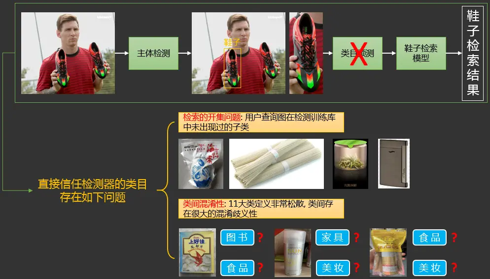 类目预测是为了确定检测抠图中物体的类别,从而方便后续用指定类目的模型进行特征提取和同款索引。大家可能会有所疑虑,因为前面检测器已经识别出了商品的位置和类目,为何不直接用检测器的类目,而是要重新来过一次类目预测呢?原因如下图 21 所示:训练检测器的数据有限,而用户上传的图片可能千奇百怪,那么训练库未出现的子类很容易造成检测器分类错误,其次是类间混淆性也会带来分类错误。