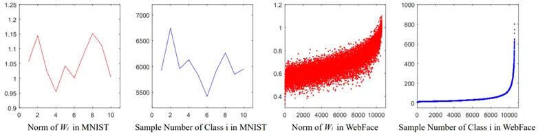 归一化包括两种,对图 23 中的分类权重 W 进行归一化,以及对特征 x 进行归一化。那么归一化的作用是什么呢?先来说说权重 W 的模长和特征空间分布不均衡的关系。有研究者[10]表明,训练数据库中样本多的类目对应的 W 的模长也会越长,表征模型越重视该类的分类正确程度,而忽视了其他样本数目少的类目,如图 24 所示,MNIST 和 WebFace 两个数据库都验证了上述的映射关系。而实际上我们希望的是每一类都能被平等的重视,特征空间中每一类能够均衡的划分整个空间,因而我们需要对 W 进行归一化,让所有类别的权重一致,即: