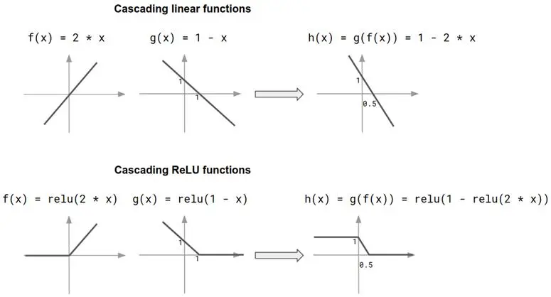 图 3.3 级联线性函数(顶部)和非线性函数(底部)。级联线性函数始终会得到线性函数。级联非线性函数(例如本例中的 relu )得到具有新颖形状的非线性函数,例如本例中的“下移”函数。这说明了为什么非线性激活及其在神经网络中的级联会得到增强的表示能力(即容量)