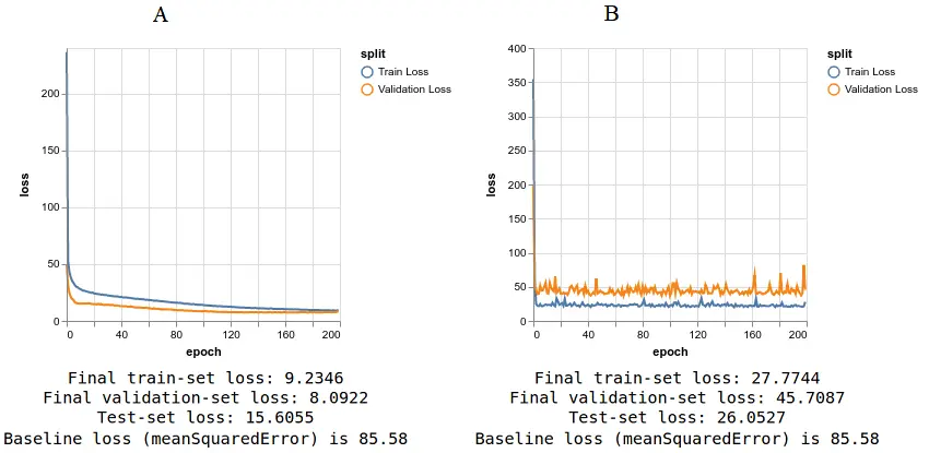 图 3.4 比较使用 sigmoid 激活(A)和不使用 sigmoid 激活(B)的训练结果。可以看出,不使用 sigmoid 会导致训练,验证和评估集的最终损失值更高(该水平与之前的纯线性模型相当),而损失曲线则较平滑。两图之间的 y 轴比例不同。