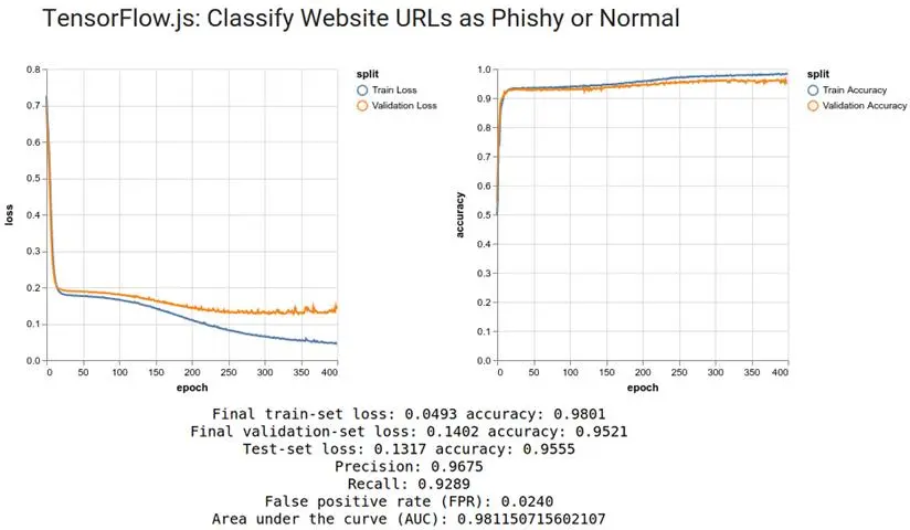 图 3.5 针对网络钓鱼网页检测的模型训练得到的示例结果。请注意底部的各种指标:准确性,召回率和误报率(FPR)。曲线下面积(AUC)在 3.2.3 节中讨论。