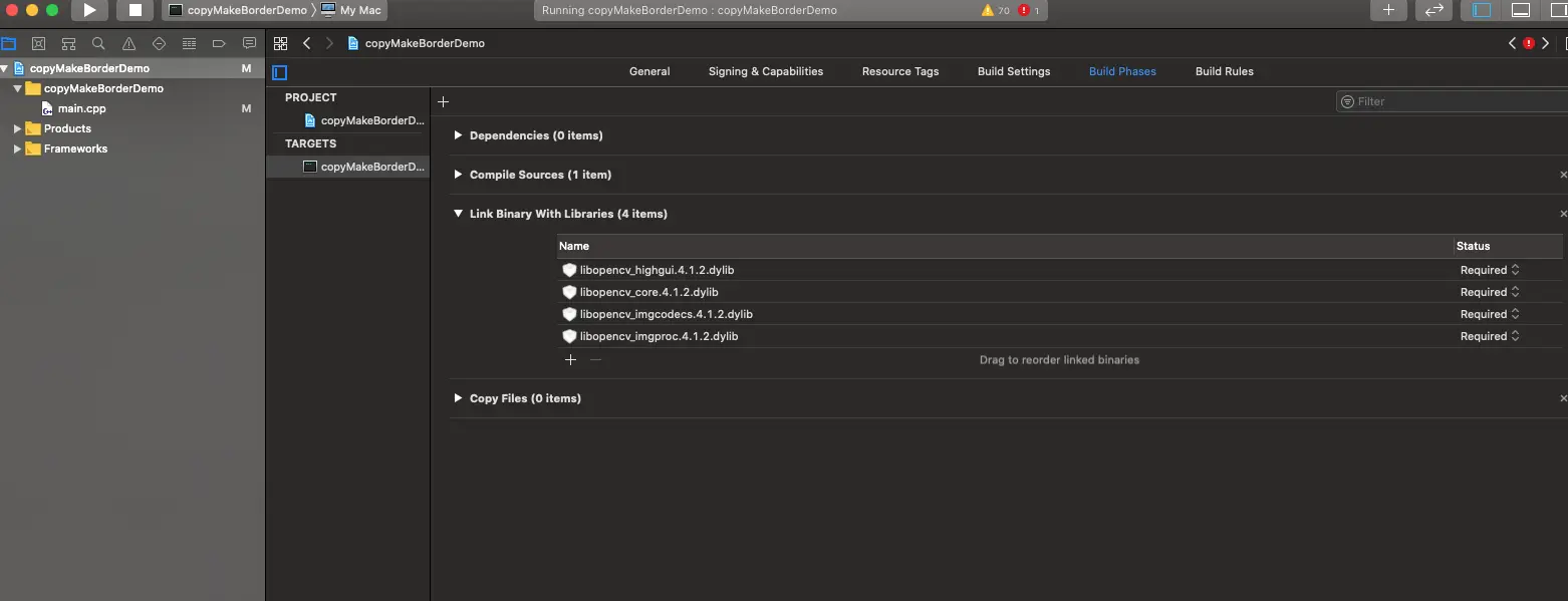 - 接下来,引入需要的 OpenCV 库, 找到 Build Phases -> Link Binary With Libraries, 然后点击添加,添加新文件, 按下 command + shift + G 输入 /usr/local/lib, 找到如下图的几个库。