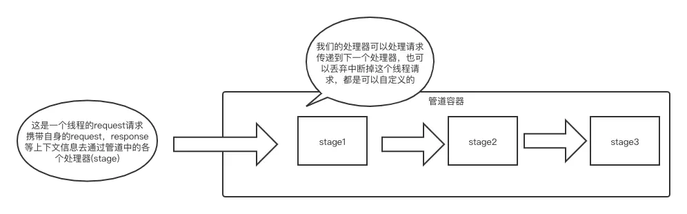 - 管道模式:大家就想象这是一个水管,里面有很多处理器,我们的请求像水流一样经过处理器去执行请求