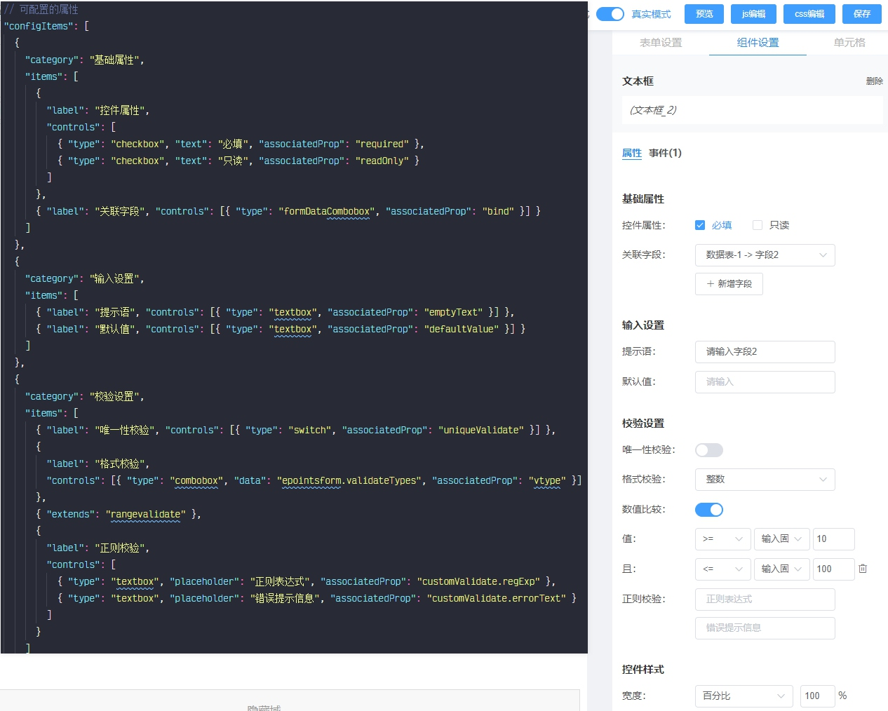 如上所示的文本输入框,整个右侧配置面板均是左侧的json文件生成。配置面板本身只用负责将相应属性的修改反应到对应的控件属性值上即可。