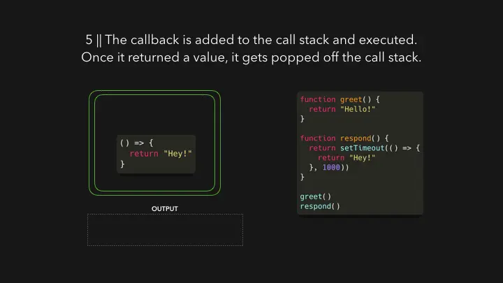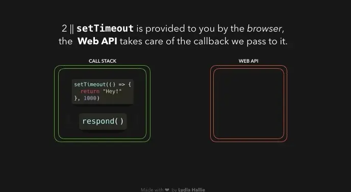 response函数返回一个setTimeout函数。setTimeout是由Web API提供的:它允许我们在不阻塞主线程的情况下延迟任务。我们传递给setTimeout函数的回调函数()=> {return 'Hey'}被添加到Web API中。与此同时,setTimeout函数和response函数从堆栈中弹出,它们都返回了它们的值。