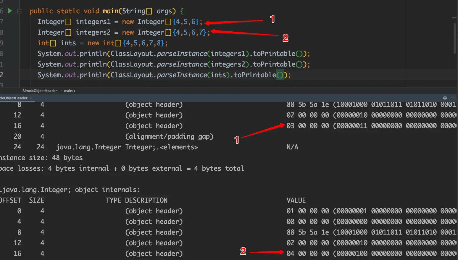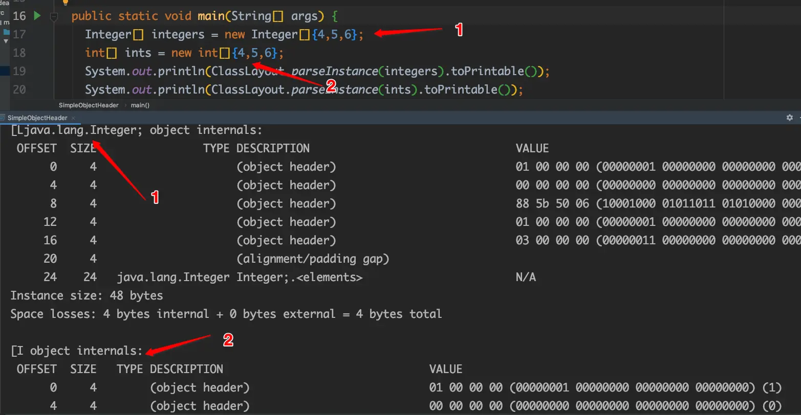 - 下面简单示意可以看出,64位虚拟机下,length出现在offset=16的位置。其中3、4等于数组长度绝不是偶然的,读者可以自行验证。