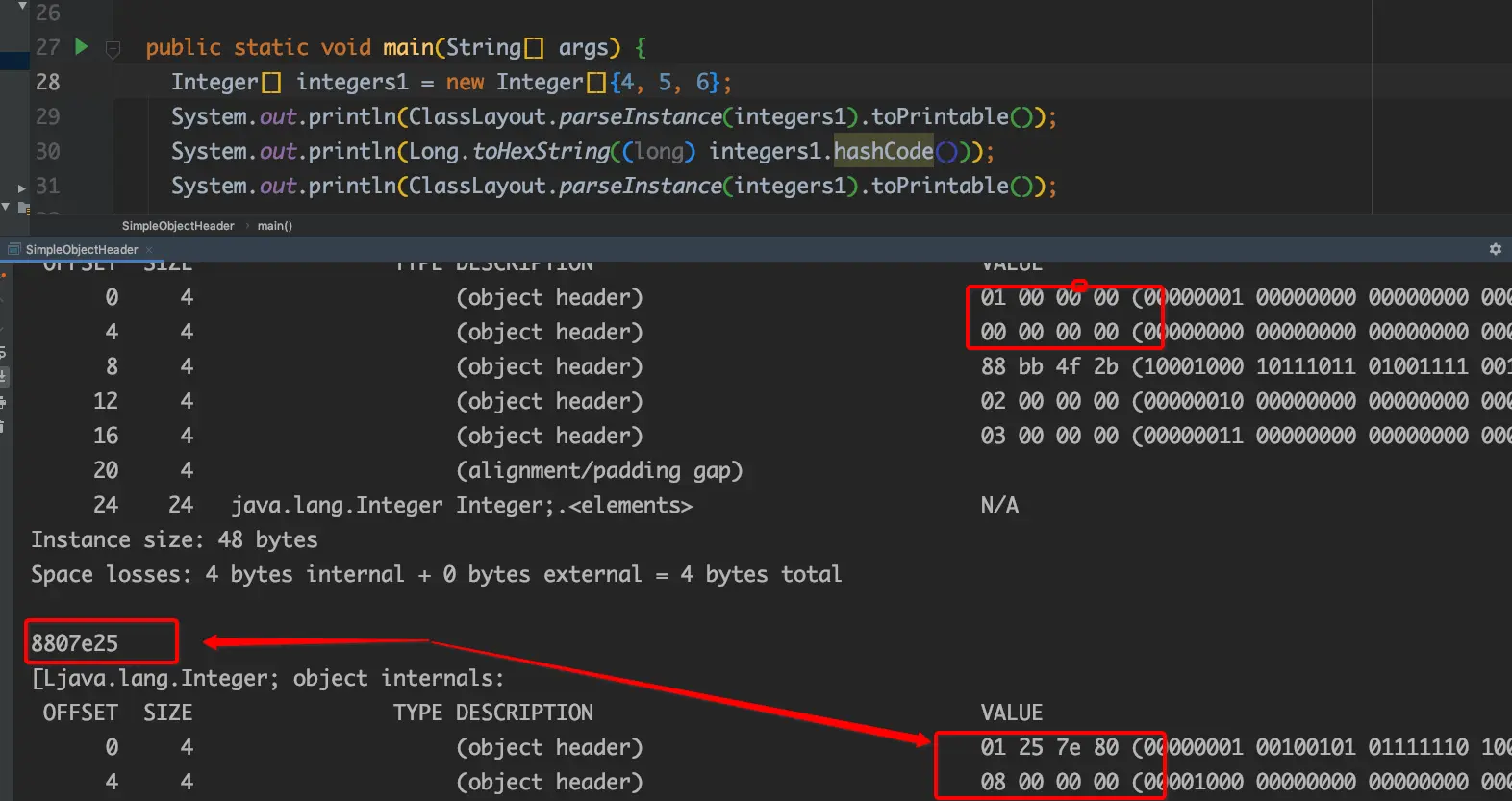 仔细看图,相信你就明白了。注意markword=00000008807e2501,其中unused25位,hashcode与integers1.hashcode()相等,2个标志位也ok。