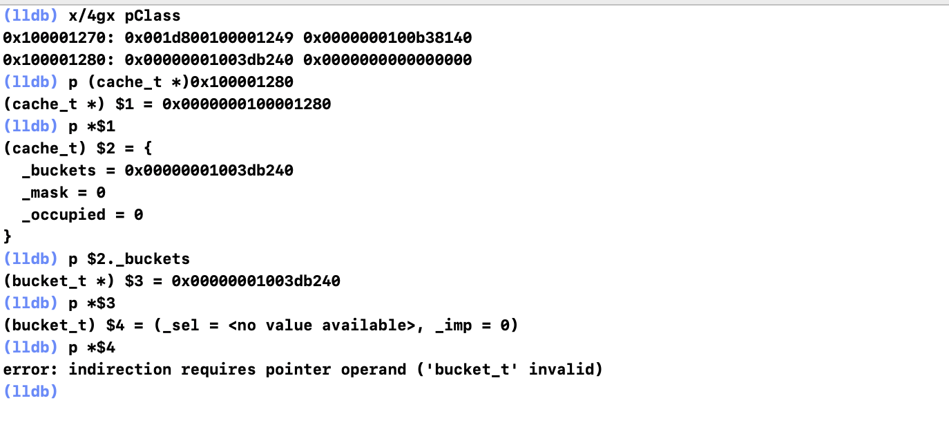 在类结构分析中 中说过:执行 x/4gx 后,第一个 8 字节代表 isa ,第二个 8 字节代表 superClass,所以首地址偏移 16 个字节就是 cache_t 的首地址,一系列的取值后发现是空的,没有缓存,那明明调用了 alloc 方法了啊,就算 alloc 方法特殊,但是也是方法啊,怎么没有缓存呢?