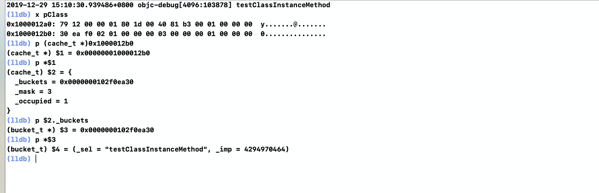 上方截图打印出来发现,_mask 为 3,_occupied 为 1,打印出了上方代码调用过的 testClassInstanceMethod 了,发现确实类的 cache_t 只是缓存的类的实例方法,并且调用一次后就会缓存。