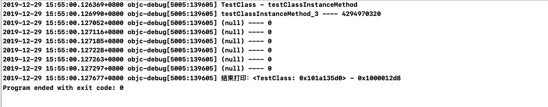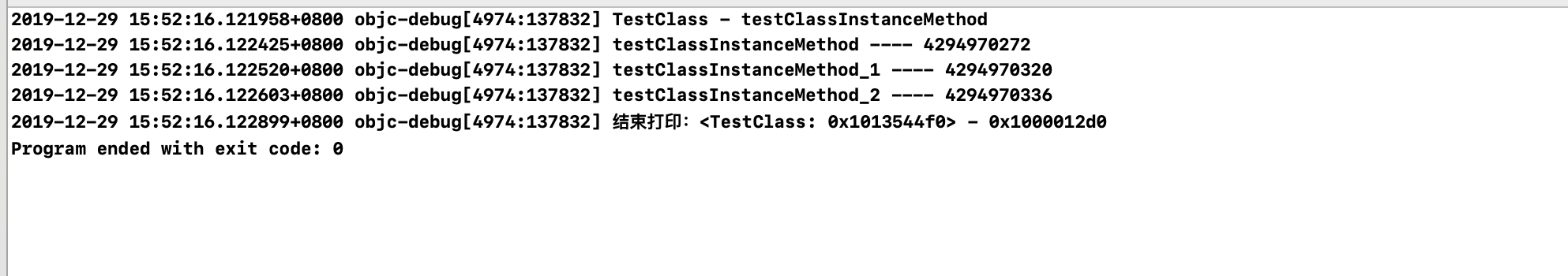 上方代码调用了3个实例方法,那我们调用4个或者多个呢?上方代码再添加一个调用 [object testClassInstanceMethod_3]; 打印结果如下: