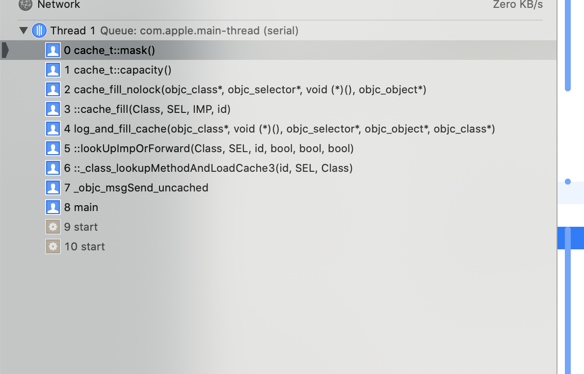 随意个 cache_t 的 mask_t cache_t::mask() 方法打个断点 ,然后再在我们调用方法前打个断点,先让程序走到我们调用方法之前,否则就会不断的进入系统方法的调用。