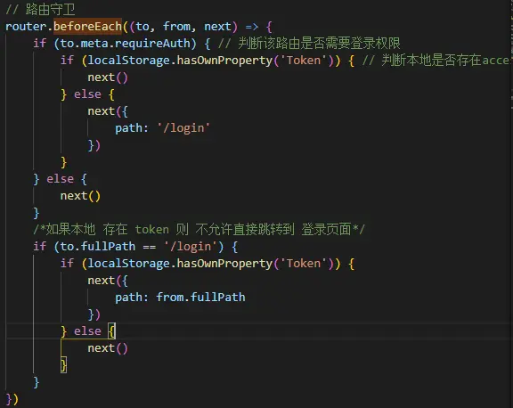 if (to.meta.requireAuth) { // 判断该路由是否需要登录权限