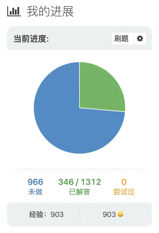 刷题上,年初预定自己在 LeetCode 上做满 400 道题,可截至今日,也不过完成了 346 题,题解记录的数量也远远低于预期。