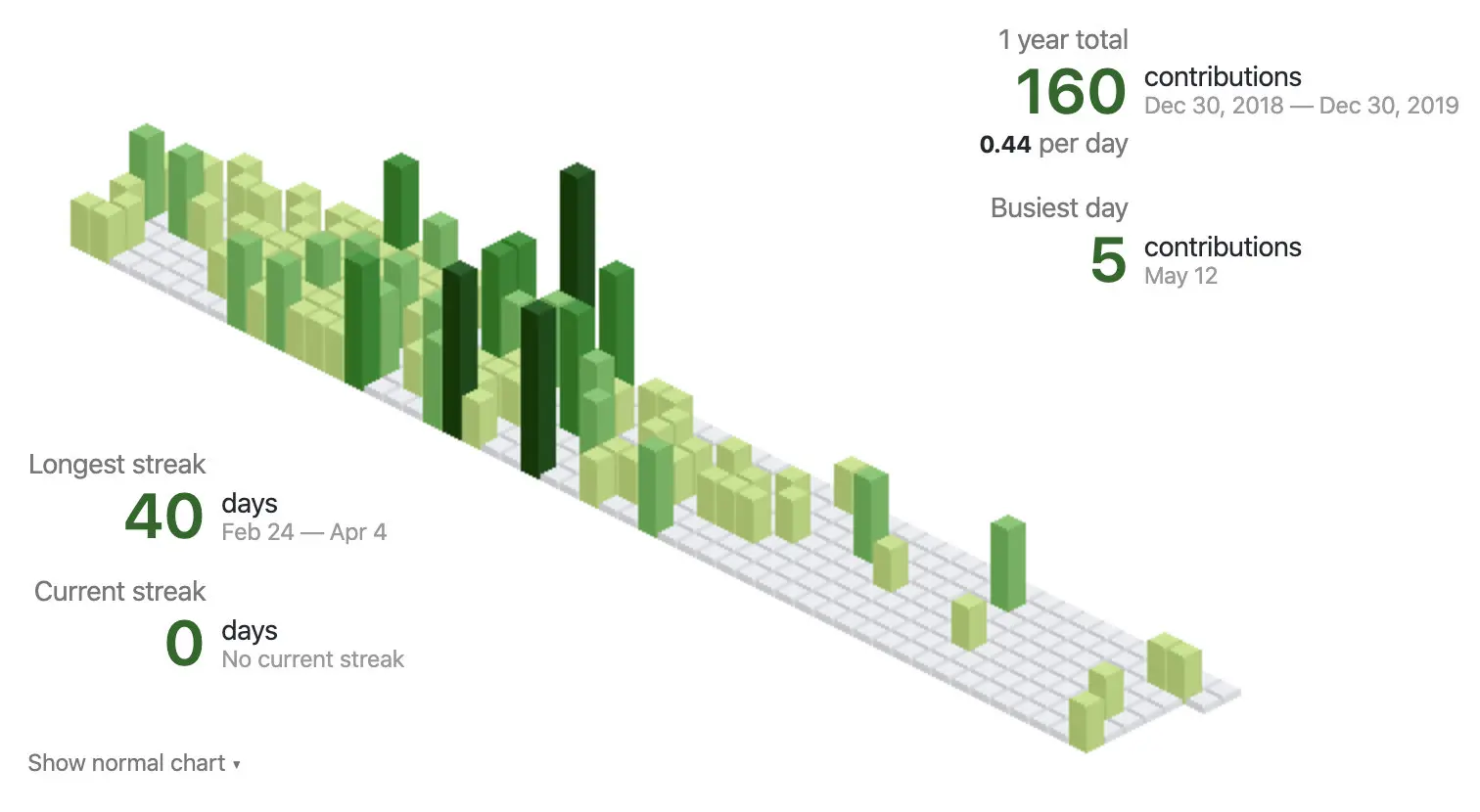 GitHub 的贡献量更是少的可怜,相比去年 318 的 contributions,今年直接缩减了一半。