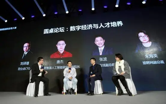 在以“数字经济与人才培养”为主题的圆桌论坛中,刘译璟与唐杰、张波、朱海英一起分享了需求端和供给端对人才培养机制的思考。