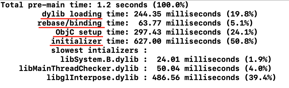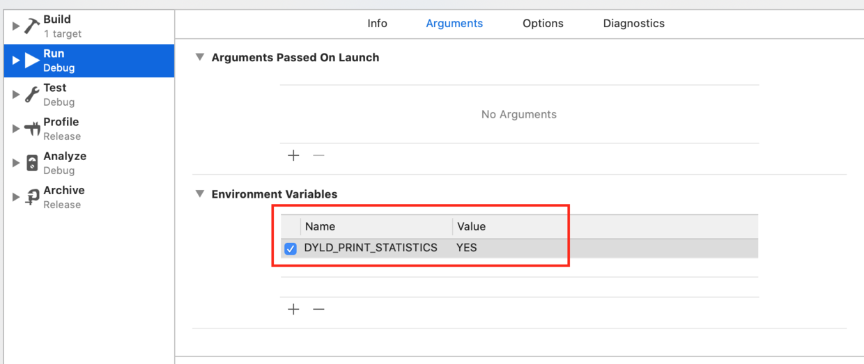 直接打开Xcode,找到Product->Scheme->Edit Scheme->Run->Arguments->Environment Variables->DYLD_PRINT_STATISTICS 设置为 YES