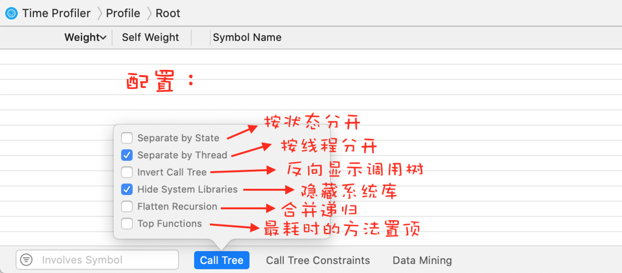 注: 1 . Separate by State:按状态分开,分析数据。 2 . Separate by Thread:按线程分开,分析数据。可找出严重消耗资源的线程,特别对于处理和渲染UI的主线程,一旦主线程受到阻塞,一定会造成App的卡顿。 3 . Invert Call Tree:反向显示调用树。把调用层级最深的方法显示在最上面。 4 . Hide System Libraries:隐藏系统级的干扰信息。 5 . Flatten Recursion:合并递归。 6 . Top Functions:置顶耗时方法。