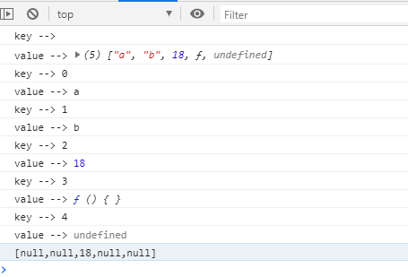 key对应索引号,value对应元素值,返回undefined、函数、symbol都会被null取代。