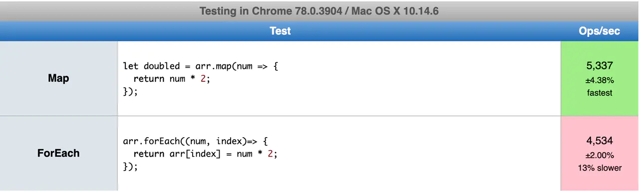代码看起来差不多,但是结果却截然相反。一些 test cases 显示 forEach 快,一些显示 map 快。老实说,我也不确定,但是我觉的在现代 web 开发中不必纠结这点速度,代码的可读性更重要。