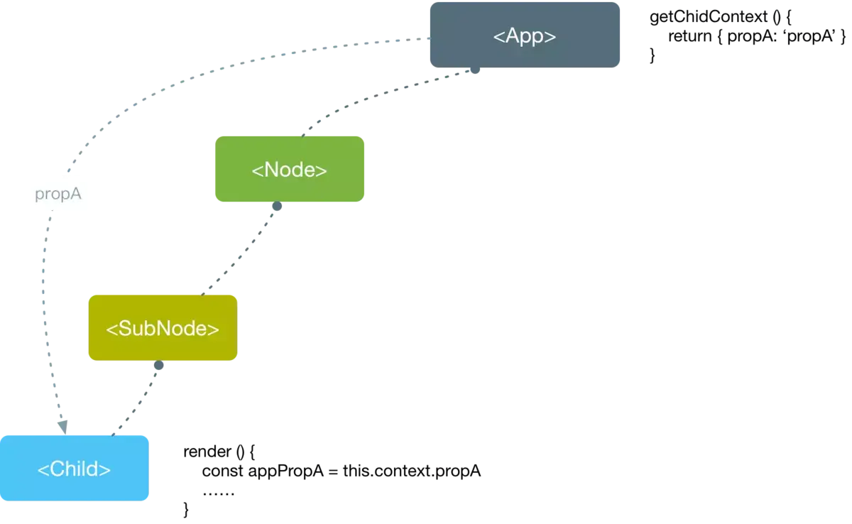 假如以JS的作用域链作为类比,React组件提供的Context对象其实就好比一个提供给子组件访问的作用域,而Context对象的属性可以看成作用域上的活动对象。由于组件的Context由其父节点链上所有组件通过getChildContext()返回的Context对象组合而成,所以,组件通过Context是可以访问到其父组件链上所有节点组件提供的Context的属性。