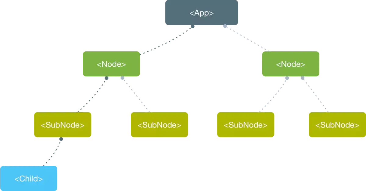 例如上图,<Child />的父组件链是<SubNode /> -- <Node /> -- <App />,<SubNode />的父组件链是<Node /> -- <App />,<Node />的父组件链只有一个组件节点,就是<App />。