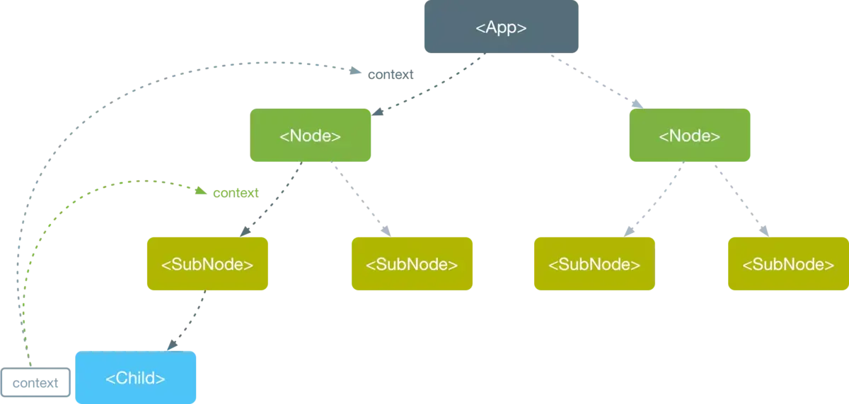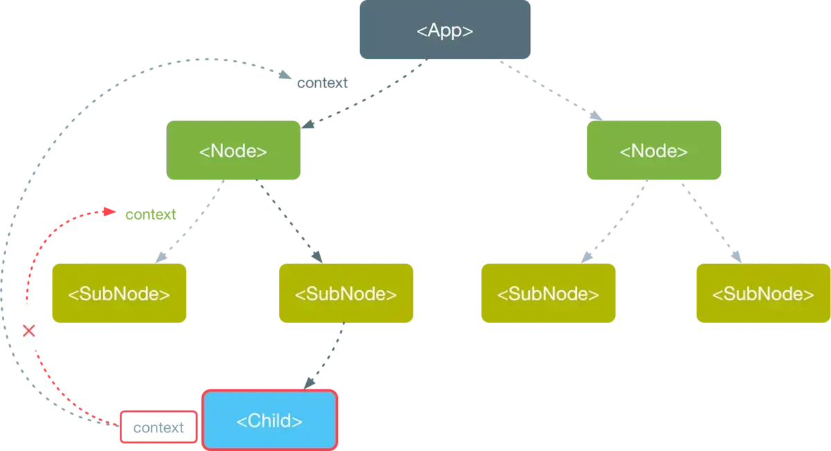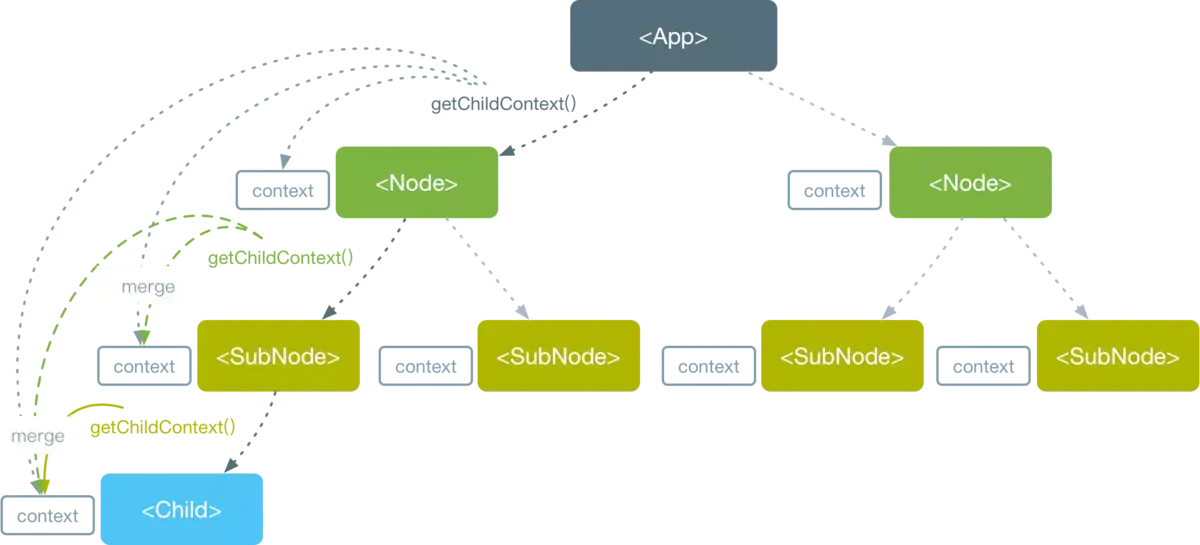 这些以树状连接的组件节点,实际上也组成了一棵Context树,每个节点的Context,来自父组件链上所有组件节点通过getChildContext()所提供的Context对象组合而成的对象。