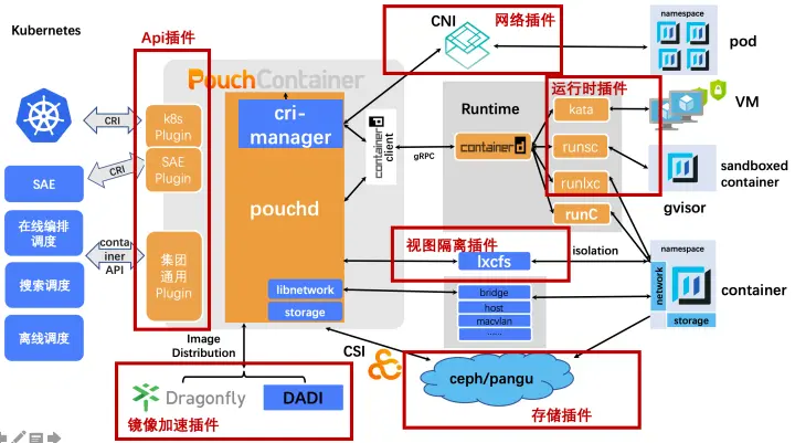 除了安全性和隔离性,我们的运行时演进还保证了标准性,今年最新版本的 PouchContainer 把 diskquota、lxcfs、dragonfly、DADI 这些特性都做成了可插拔的插件,不需要这些功能的场景可以完全不受这些功能代码的影响。甚至我们还对一些场景做了 containerd 发行版,支持纯粹的标准 CRI 接口和丰富的运行时。