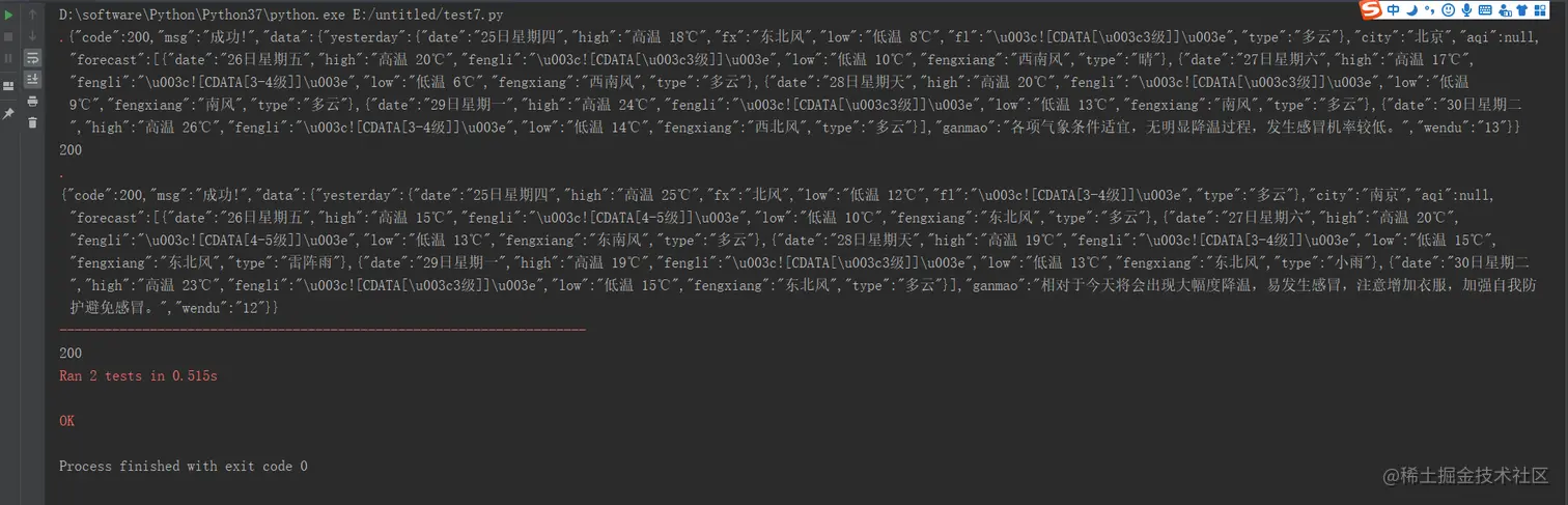 上一篇通过简单的案例给小伙伴们介绍了一下unittest断言,这篇我们将通过结合和围绕实际的工作来进行unittest的断言。这里以获取城市天气预报的接口为例,设计了 2 个用例,一个是查询北京的天气,一个是查询
