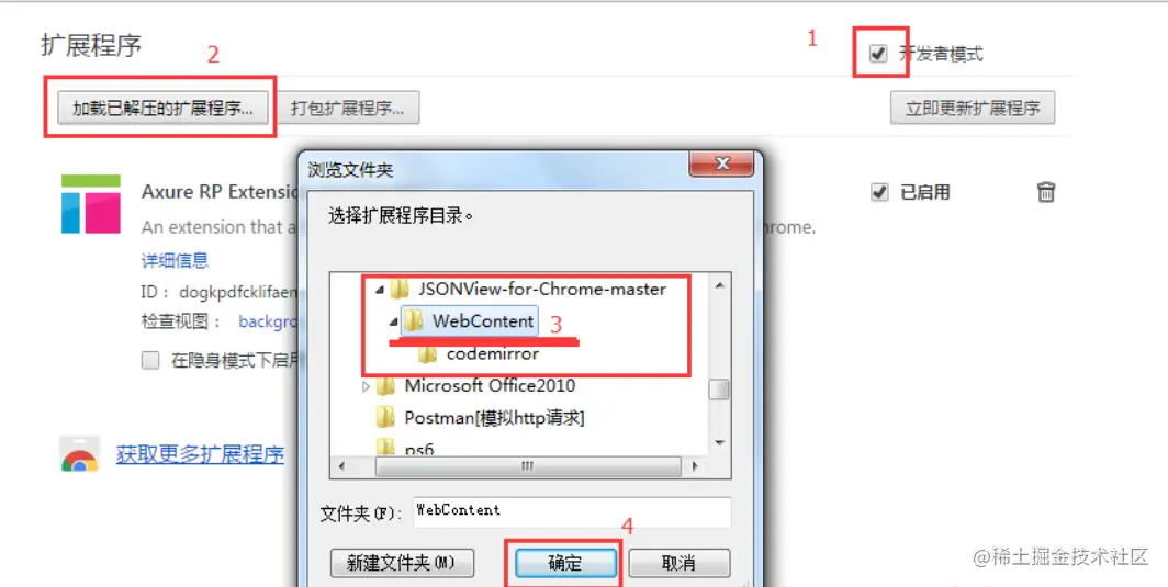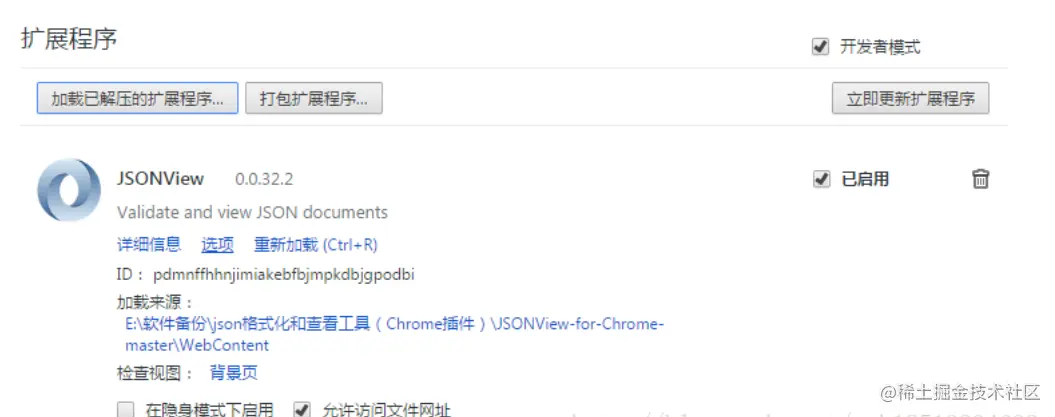 选中开发者模式,点击【加载正在开发的扩展程序…】,选择插件目录(D:\JSONView-for-Chrome-master\WebContent)