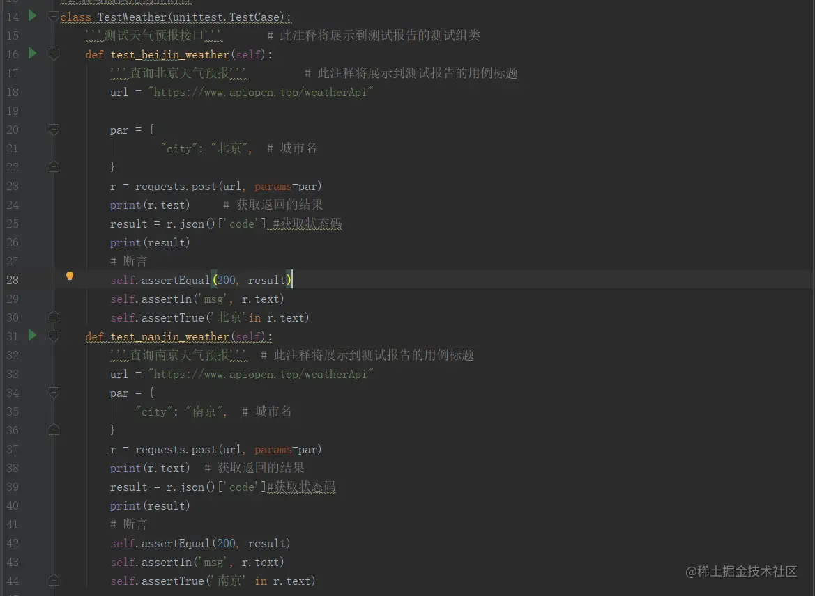 15 '''测试天气预报接口''' # 此注释将展示到测试报告的测试组类