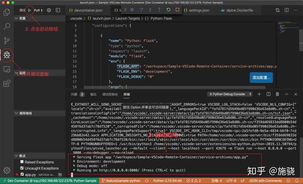 在sample项目中有一个文件.vscode/launch.josn这个就是调试配置文件。sample中已经有了Flask的配置内容。我们将其中"FLASK_APP"项修改成准确的路径指向app.py。然后启动调试进程。