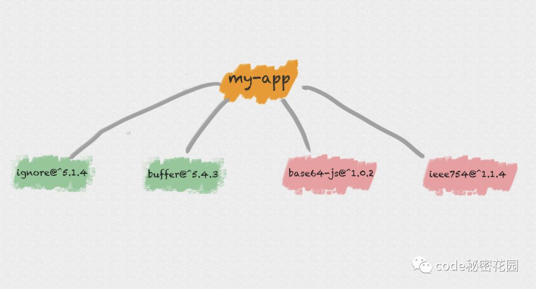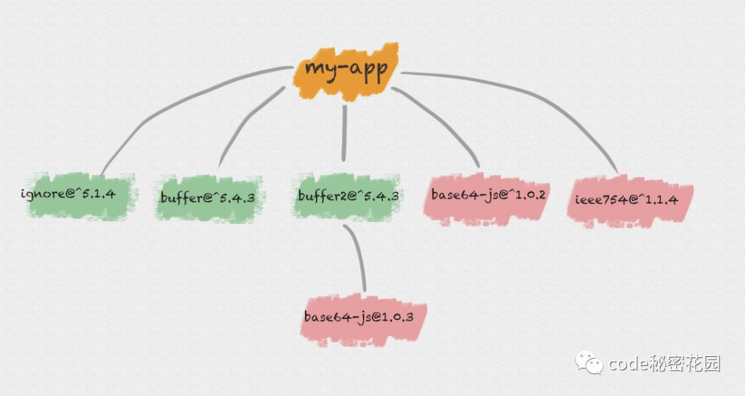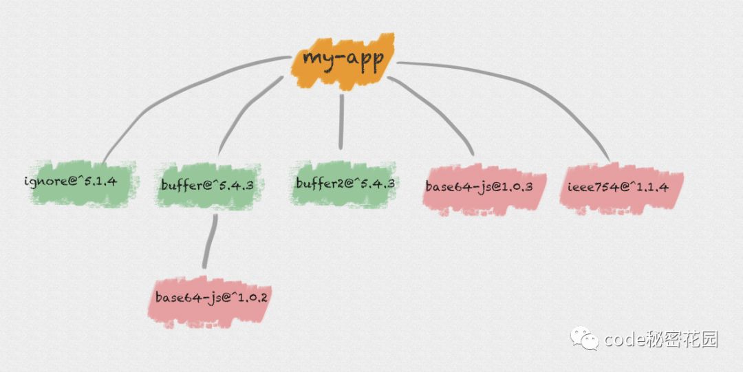 试想一下,你的APP假设没有依赖 base64-js@1.0.1 版本,而你同时依赖了依赖不同 base64-js 版本的 buffer 和 buffer2。由于在执行 npm install 的时候,按照 package.json 里依赖的顺序依次解析,则 buffer 和