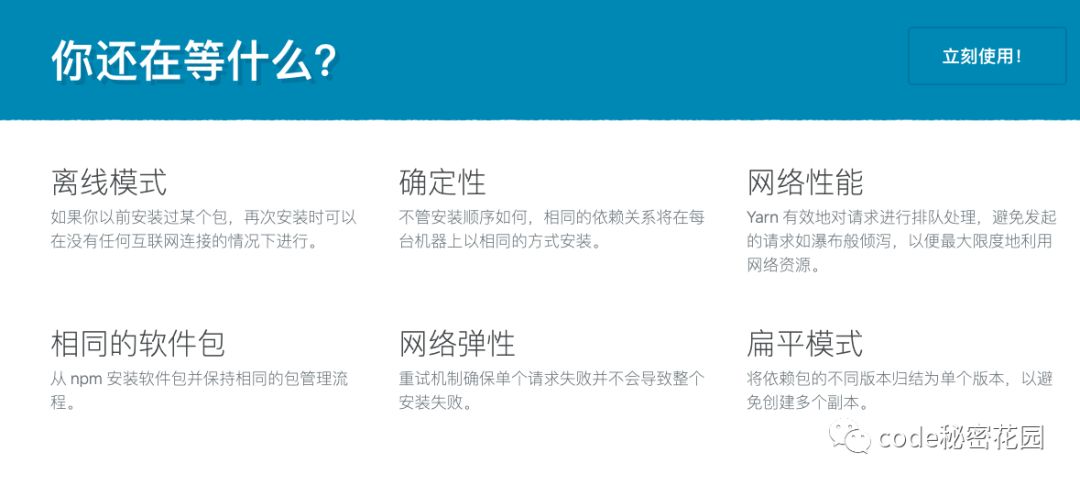 上面是官网提到的 yarn 的优点,在那个时候还是非常吸引人的。当然,后来 npm 也意识到了自己的问题,进行了很多次优化,在后面的优化( lock文件、缓存、默认-s...)中,我们多多少少能看到 yarn 的影子,可见 yarn 的设计还是非常优秀的。