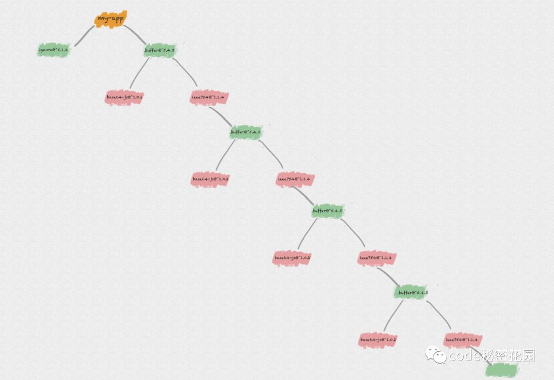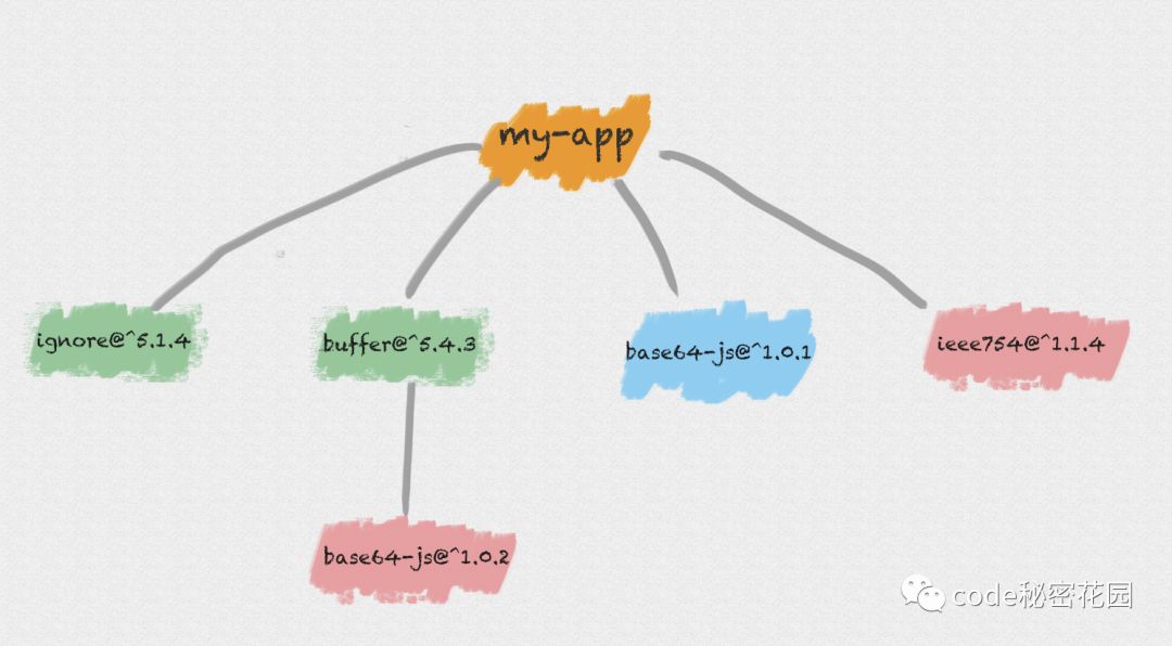 我们在 my-app 中依赖的 base64-js@1.0.1 版本与 buffer 中依赖的 base64-js@^1.0.2 发生冲突,所以 base64-js@1.0.1 需要安装在 buffer 包的 node_modules 中,对应了