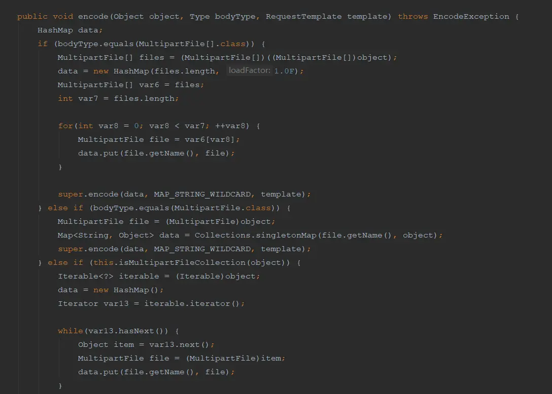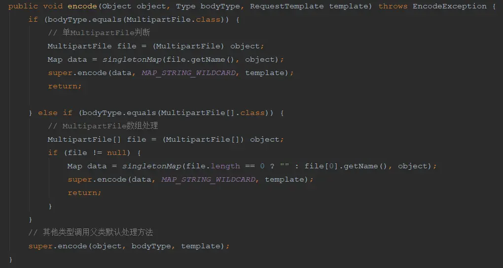 但是因为本人公司架构设计原因, 需要批量上传, 且需要使用Feign转发至另一服务端. 最开始我也是先百度, 发现于此相关的文章一大堆 , 于是选择了一篇(并无4方法)开始使用到我的项目. 最开始一切都很顺利, 上传一气喝成. 但是问题在于我上传多份文件时, 最终只有一份到达另一方服务端(注意:本地断点上传接口是清清楚楚多份文件流, 到另一服务端时, 只有一份文件流). 于是开始百度搜索Feign传输MultipartFile[]的坑, 于是发现4方法. 基本出于一致全是重写encode方法, 如下