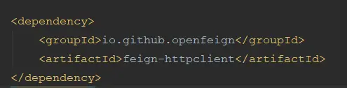 <dependency> <groupId>io.github.openfeign</groupId> <artifactId>feign-httpclient</artifactId></dependency>并在feign的配置下添加