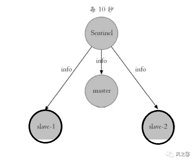 任务1:每个哨兵节点每10秒会向主从节点发送info命令获取最新拓扑结构图,哨兵只需配置对主节点的监控,通过向主节点发送info,就可以获取从节点的信息,当有新节点加入可以马上感知到。