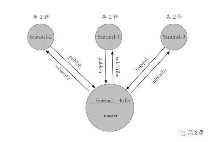 任务二:每个哨兵每隔2秒会向redis数据节点的指定频道发送该哨兵对于主节点判断和哨兵信息,同时每个哨兵节点也会订阅该频道,来了解其它哨兵节点的信息和对主节点的判断,通过消息的publish和subscribe来实现。