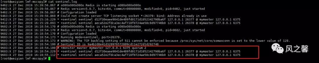 红框的圈出来代表集群节点的基本信息,master的ip、端口号,从节点的数量,哨兵的个数。 4.查看sentinel日志,我们看到哨兵正在监控redis集群