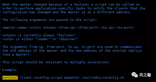 客户端重新配置主节点参数脚本 当一个master由于failover而发生改变时,这个脚本将会被调用,通知相关的客户端关于master地址已经发生改变的信息。 以下参数将会在调用脚本时传给脚本: 目前总是“failover”, 是“leader”或者“observer”中的一个。 参数 from-ip, from-port, to-ip, to-port是用来和旧的master和新的master(即旧的slave)通信的 这个脚本应该是通用的,能被多次调用,不是针对性的。