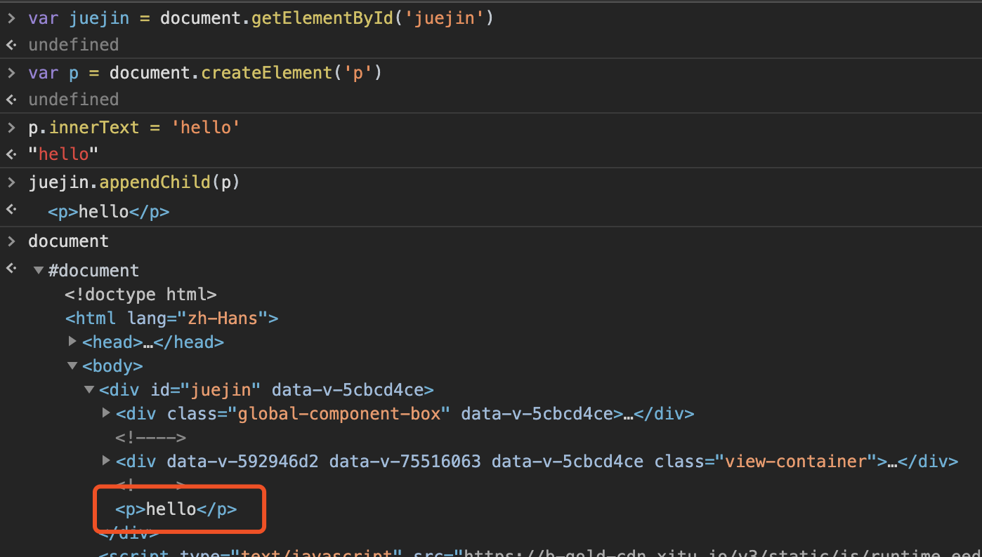 比如在id为juejin的div中添加一个p标签。