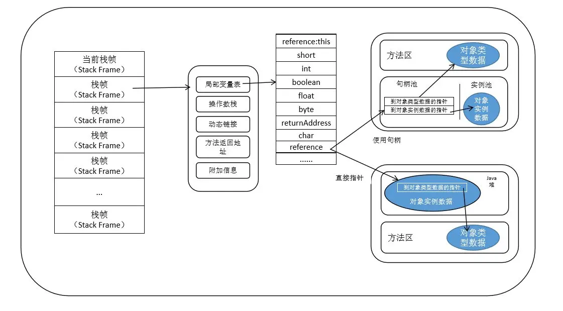 boolean、int、short、char、byte、float、reference或者returnAddress类型的数据。 - reference类型代表一个对象实例的引用(HotSpot中就是obj在堆中的地址)