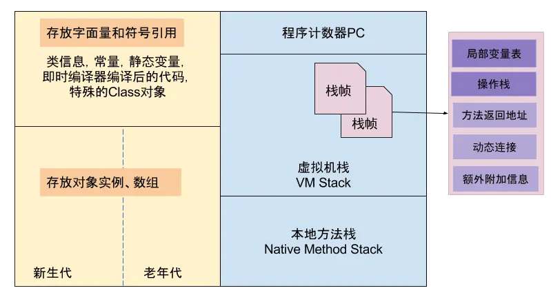 - 每个栈帧中包含一个指向运行时常量池中该栈帧所属方法的引用,持有这个引用是为了支持方法调用过程中的动态连接