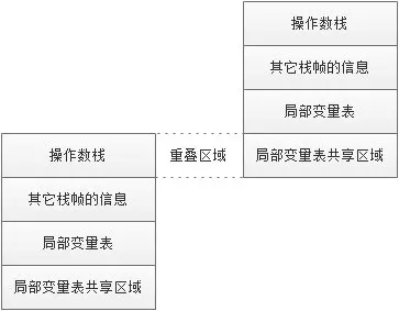 - 下面栈帧的操作数栈会和上面栈帧的局部变量表有部分的重叠,共享一部分局部变量,无需额外数据复制传递