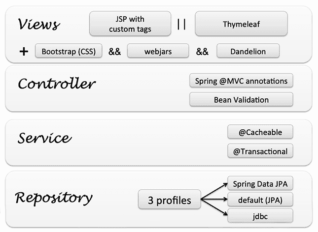 使用控制反转和 MVC 的 Web 表示层,基于 JavaBeans 的应用程序配置,通过 JDBC,Hibernate 或 JPA 进行数据库访问,基于 JMX 声明式事务管理的应用程序监视,使用 AOP 数据验证来支持但不依赖于表示层的 Spring 框架提供了大量有用的基础结构,以简化应用程序开发工作。
