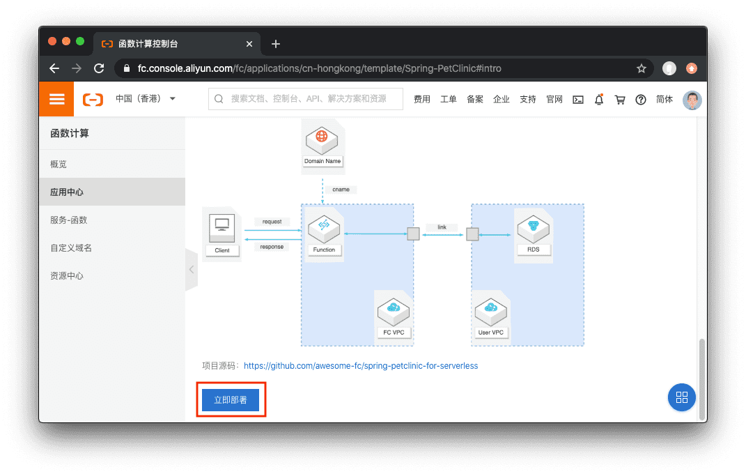 - 打开函数计算 Spring PetClinic 应用详情页。如果您尚未开通函数计算服务可能需要先,开通服务是免费的,另外函数计算有每月免费额度,试用服务不会产生费用。