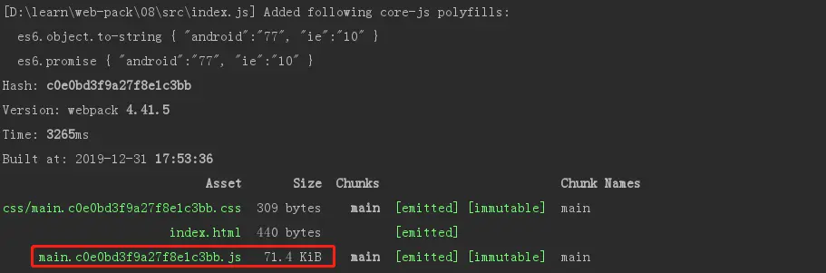 我们注意到 output 中的 filename 中有一个 [name],[hash],其中name是 entry 的名字,默认是 main ,hash 是打包根据内容后计算出的一个 hash值,保证文件的唯一性,可以通过[hash:8] 表示取其前8位。