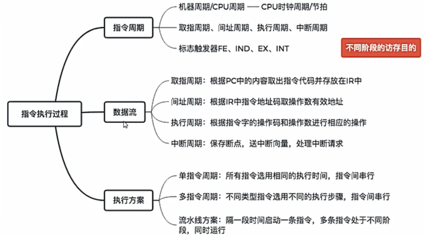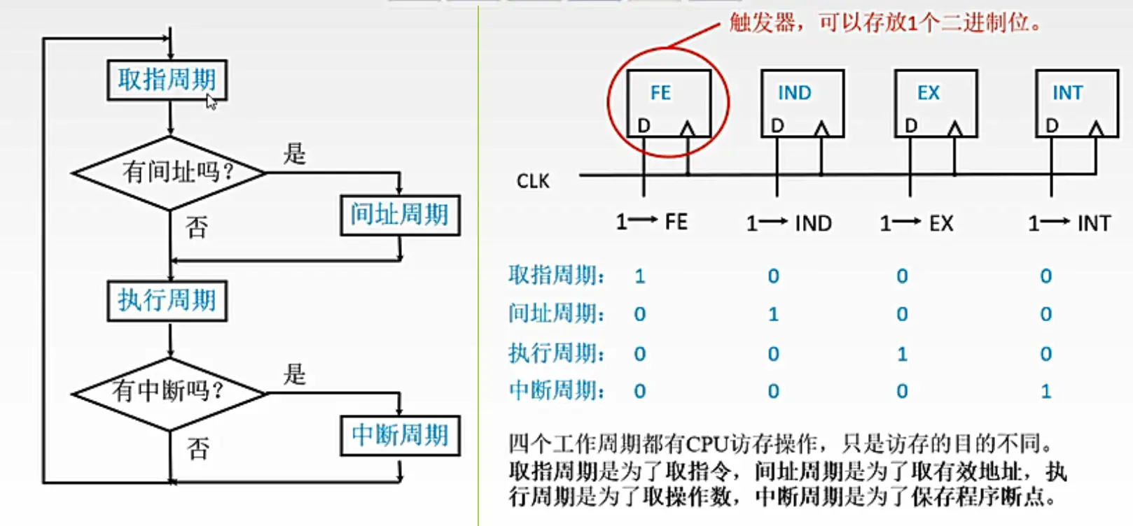 - 一般组成:取指周期、取数周期(寻址周期)、执行周期和中断周期。